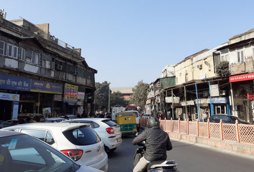 Ich bin jedenfalls die Hauptstraße (in die richtige Richtung, denk ich) durch ein Stück Altstadt mit nem Delhi Gun Shop und unglaublich viel Autowerkstatt und -teile usw. an Polizeistation und St. James Church, Frauen-Schule u. a. vorbei dann in Richtung Fluss abgebogen. Hab versucht abzubiegen. Ich steckte aber schnell zwischen Straßen und Schnellstraßen und Auffahrten zu Hochstraßen. Mitten im Gewühl an einer Kreuzung hockte ein Mann und pulte einem anderen Hockenden mit einem dunkelblauen Stäbchen im Ohr. Wohl eine Dienstleistung. Ich hätte es gar nicht gesehen, aber der Puler winkte mich heran. Ich musste ablehnen. Ich mochte mich nicht zu ihm an den Bordstein setzen und bei vollem Verkehr an der Ampel mir in den Ohren rumstochern lassen. Die Sache war mir zu suspekt. Ich lief weiter und hatte dann wohl das Salim Garh Fort im Rücken und eine Obdachlosensiedlung zwischen zwei Straßen, dann zwischen Straße und Fluss vor mir. Sah dann die Straße, die über den Fluss führte mit Rush-Hour-Verkehr voll und die Straßen dahin nicht überquerbar. Nachdem ich schon eine riskante Situation produziert hatte, gab ich das lieber auf. Ich wählte eine nach unten führende Straße, hoffte auf eine Ausfahrt in Richtung Stadt. Ein Mann mit seinem Dienstgefährt überholte mich und hatte eine ölige Pfanne mit Kartoffelpuffer hinten drauf. Hunger hatte ich, also rief ich. Er blickte sich nur kurz um, sah meinen Winker, hielt und baute fix seinen Stand zum Verkauf auf. In null-komma-nix hatte ich meine zwei Puffer auf dem Standstreifen bei laufendem Feierabendverkehr aufgewärmt. Er war schneller weiter als ich mit meinen heißen Dingern in der Hand. Endlich unter der Hochstraße durch kam ich in verkehrsberuhigteres Gebiet an eine Kreuzung, wo wohl Taxi- und Tuktukfahrer Teepause machten. Da nahm ich mir dann ein Tuktuk und ließ mich zum Red Fort bringen. Die Metro-Station erkannte ich sofort. Und der Rest war nur noch eine eingeklemmte Fahrt in einer vollgestopften Metro.