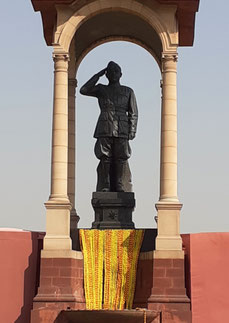 Dann endlich die Zufahrt zum All India War Memorial. Breit, lang, asphaltiert und Baustellen an jedem zweiten Meter, also Stolperpfad auf hohem Niveau. Aber dann kehrte Ruhe ein, in mich und Beschaulichkeit in die Situation. Die Gloria des großen Helden. Es stand nicht dran, wer es war, aber er sah aus wie die großen russischen Jungs aus Bronze bei uns oder in Moskau. Leider konnte ich durch den Schatten des Baldachins sein Gesicht nicht gut sehn, nur, dass er ne Brille trägt. Ansonsten, schlanker, dünner, es hätte Kim Jin Jun sein können.
