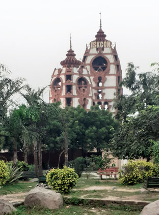 Danach wanderte ich keine 2 km weiter zum hinterm „Berg“ liegenden ISKCON-Tempel. Er wurde ab 1993 entworfen und gebaut und ist einer der größten Tempelkomplexe in Indien. ISKCON ist wohl der größte Zweig der Gaudiya Vaishnava-Tradition und hat seit dem frühen 16. Jahrhundert Anhänger in Indien. Die Religion ist seit Anfang des 20. Jahrhunderts auch in Amerika und Europa verbreitet. ISKCON = Internationale Gesellschaft für Krishna-Bewusstsein, als Hare-Krishna-Bewegung oder Hare-Krishnas bekannt, wurde 1966 in New York gegründet .