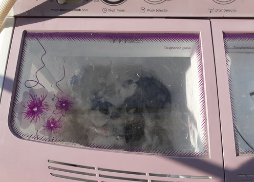 Doch zunächst warfen wir die Waschmaschine an, die den meisten Platz auf dem Balkon einnimmt und in ihrer Farbigkeit von weiß bis Violetta an friedlich fröhlich vor sich hin wuschelnde Hausfrauen im passend farbigen Kittel erinnert. Es ist ein kindliches Vergnügen, wieder mal in die sich im Seifenschaum-Dreckwasser drehende Wäsche zu schauen, hineinzufassen, sie herauszuziehen, sie wieder ins Geschäum zurückfallen und untergehen zu sehen. Es ist ein Halbautomat. Das heißt man, bzw. wohl vor allem frau steht mehr oder weniger daneben oder ist in kurzen Zeitabständen mit der Waschmaschine beschäftigt: Wasser händisch einlaufen lassen über den Schlauch, Wasser abpumpen lassen, wieder einfüllen lassen, wieder abpumpen, solange bis keine Seife mehr sichtbar ist – das heißt beim Waschvollautomaten „Spülgang“. Danach die neben dem Wasch- und Spülbehälter beieingebaute Wäscheschleuder befüllen, die Absperrhimmelscheibe oben drauf, den pinkrosavioletten Deckel schließen, den beeindruckenden silbernen Schalter umlegen und das Geknatter und Gehoppel der Schleuder erwarten und bekommen. Fast trocken sind die Handtücher, die Bettdecke und der Kochwäschenkleinkram danach. Ok, jetzt kann Ann sie benutzen. Es war besser so, es zu tun, und alle Viren und Bakterien aus unseren unheimlichen Gedanken zu waschen. Beruhigend. Ann weist auch noch mal auf die braune Brühe hin, die beim Waschen und Spülen zu sehen war.